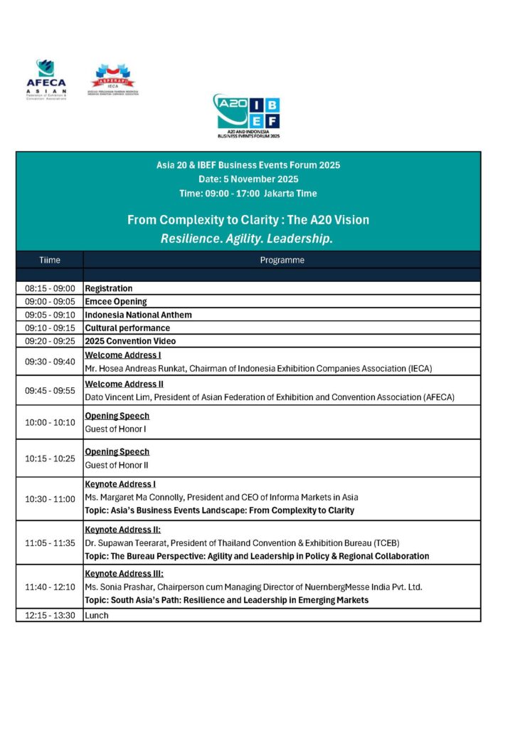 As AFECA commemorates its 20th anniversary, the AFECA Asia 20 Business Events Forum 2025 (A20) is set to take place on 5th November 2025 at the Jakarta International Expo, setting the stage for a pivotal gathering of Asia’s business events community. This landmark forum will unite government representatives, industry leaders, and MICE professionals from across the region for a dynamic exchange of ideas and collaborative action.